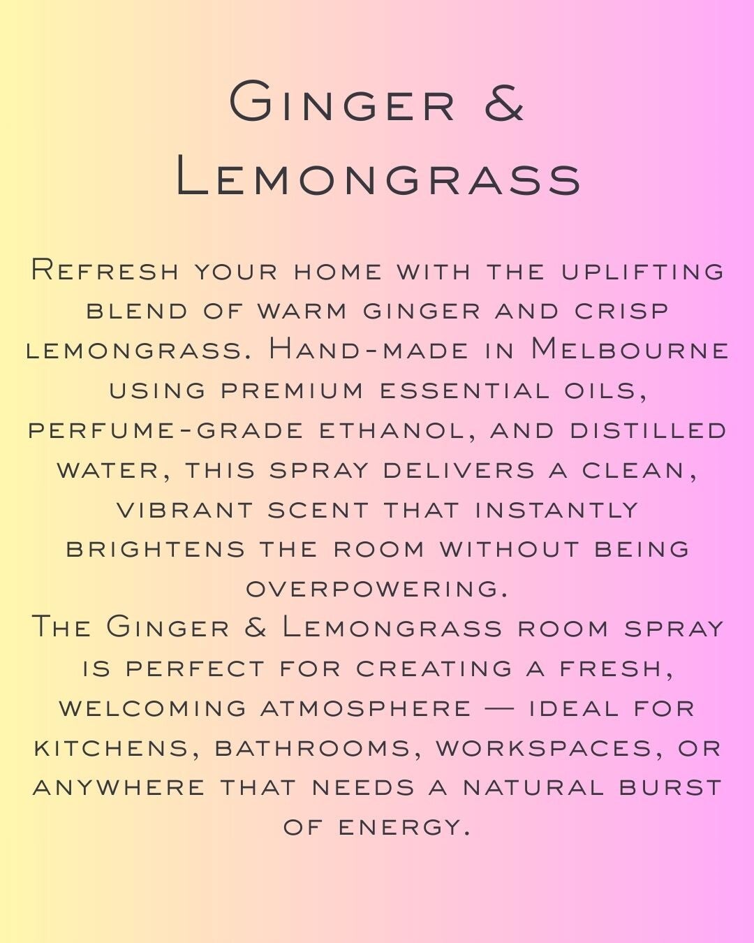 Made in Melbourne using a gentle, long-lasting base and premium fragrance oils, our sprays deliver a clean, even mist that lingers beautifully without feeling overpowering. Every bottle is hand-mixed, hand-poured, and infused with intention — because scent should feel like self-care, not just a fragrance.